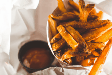 A close-up of crispy golden French fries served in a paper cone with a side of ketchup, highlighting their texture and seasoning.