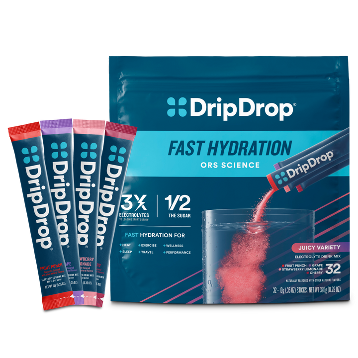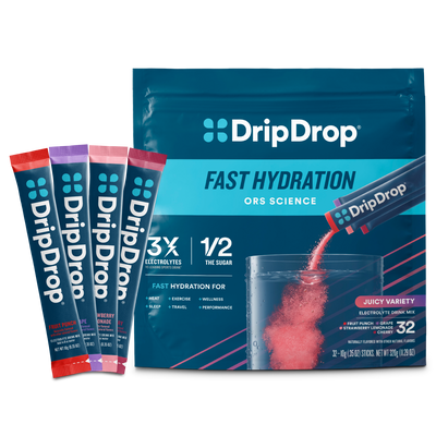 Doctor-developed DripDrop contains the sodium electrolyte levels and lower glucose content required to facilitate fast fluid absorption, AND it tastes great. Packed with essential electrolytes like sodium, potassium, and magnesium, plus zinc and vitamin C for immune support, it's an effective rehydration solution.