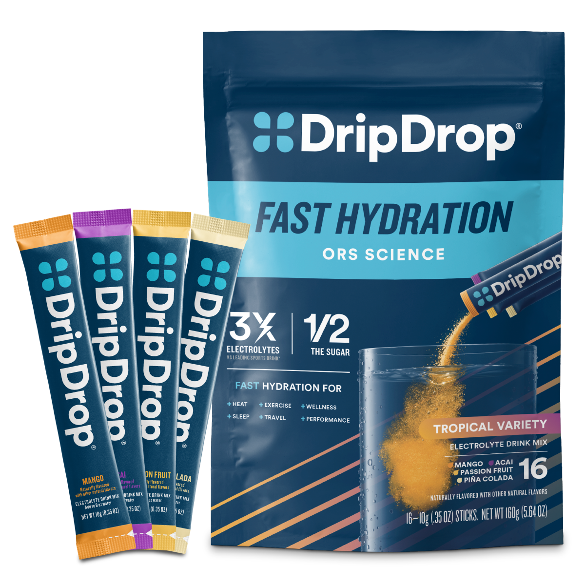 DripDrop Tropical Variety Pack Electrolyte Powder, 8 oz sticks, 16 count
