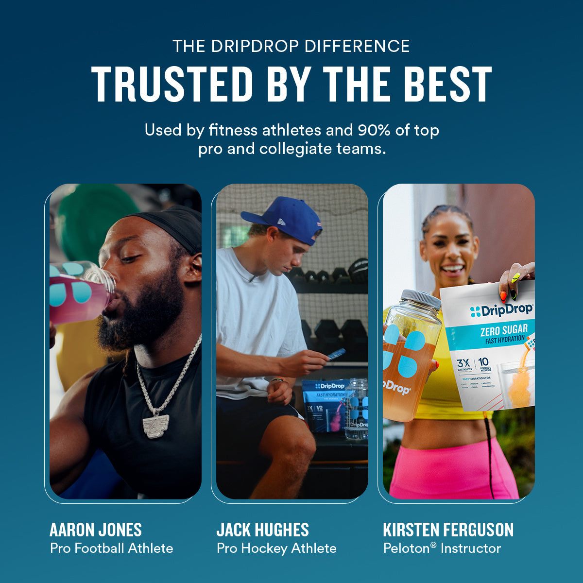 Doctor-developed DripDrop contains the sodium electrolyte levels and lower glucose content required to facilitate fast fluid absorption, AND it tastes great. Packed with essential electrolytes like sodium, potassium, and magnesium, plus zinc and vitamin C for immune support, it's an effective rehydration solution.