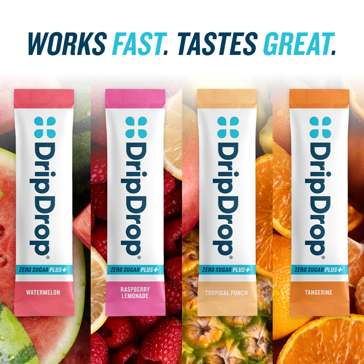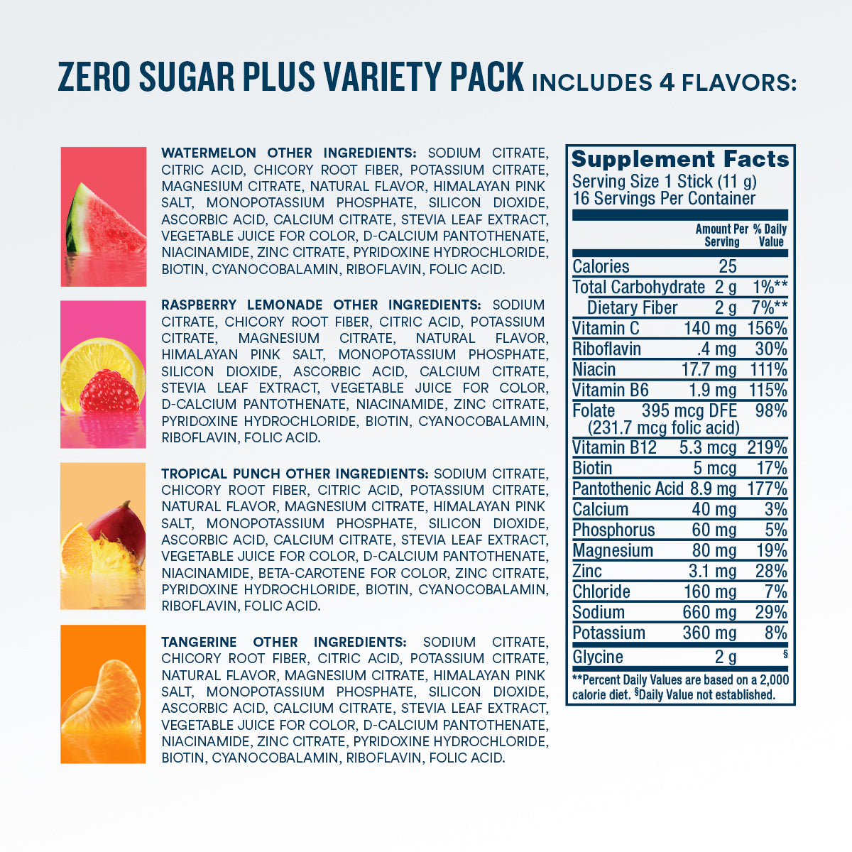 A standout Zero Sugar Plus 4-flavor variety pack featuring Watermelon, Tangerine, Raspberry Lemonade, and Tropical Punch. Clean ingredients, unmatched taste.