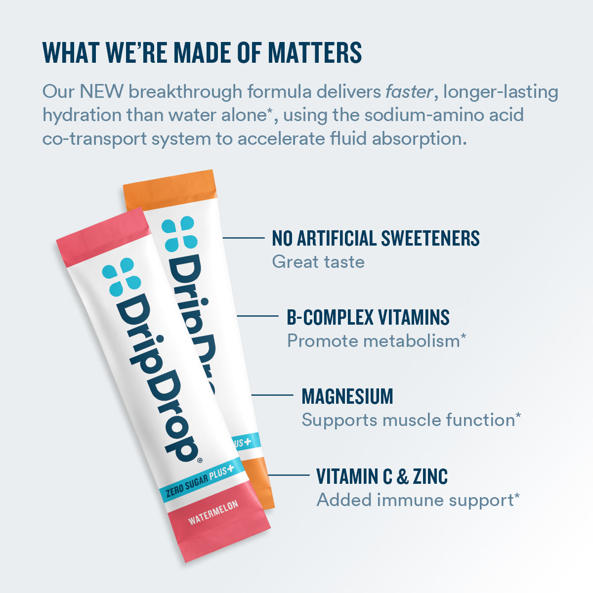 Doctor-developed DripDrop contains the sodium electrolyte levels and lower glucose content required to facilitate fast fluid absorption, AND it tastes great. Packed with essential electrolytes like sodium, potassium, and magnesium, plus zinc and vitamin C for immune support, it's an effective rehydration solution.