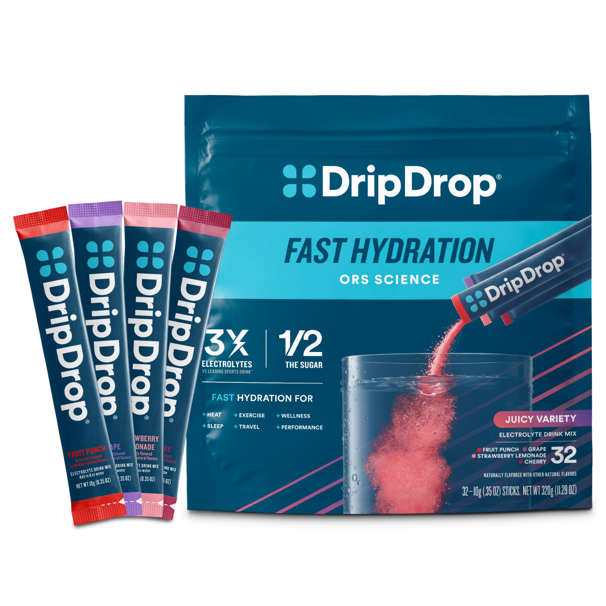 DripDrop Juicy Variety Pack Electrolyte Powder, 8 oz sticks, 32 count