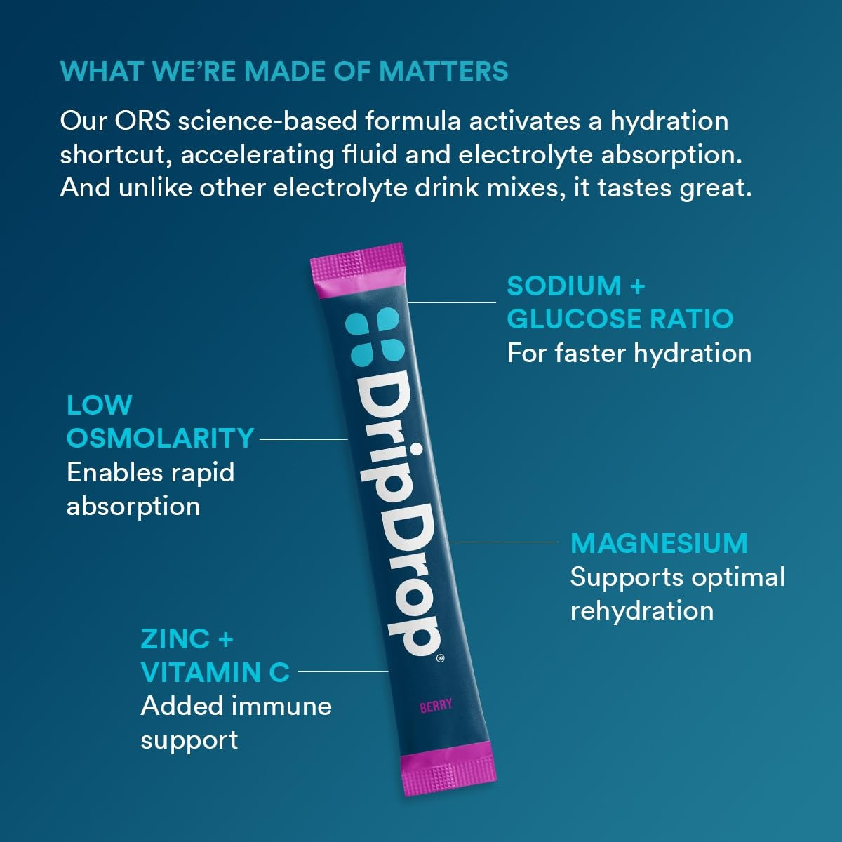 Doctor-developed DripDrop contains the sodium electrolyte levels and lower glucose content required to facilitate fast fluid absorption, AND it tastes great. Packed with essential electrolytes like sodium, potassium, and magnesium, plus zinc and vitamin C for immune support, it's an effective rehydration solution.