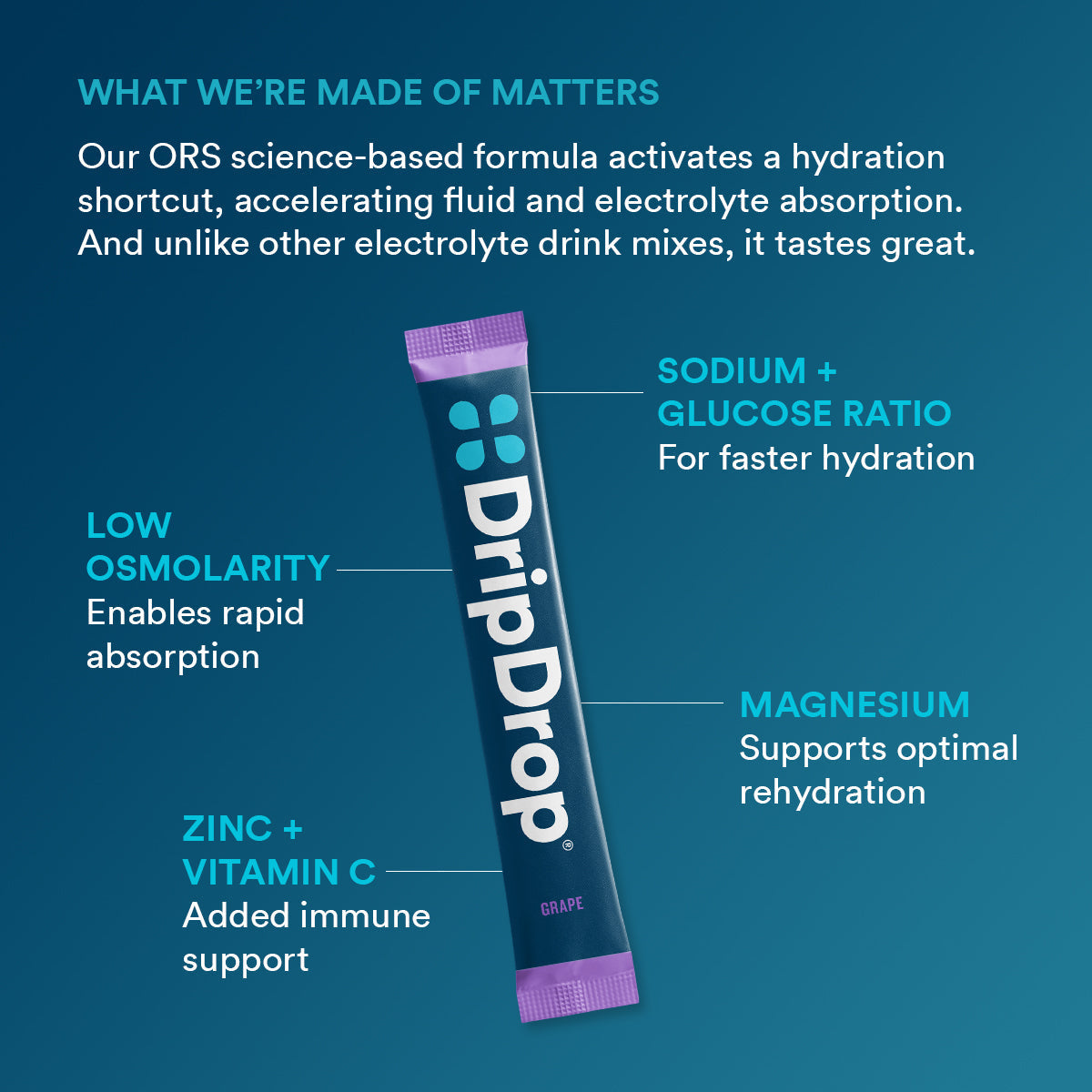 Doctor-developed DripDrop contains the sodium electrolyte levels and lower glucose content required to facilitate fast fluid absorption, AND it tastes great. Packed with essential electrolytes like sodium, potassium, and magnesium, plus zinc and vitamin C for immune support, it's an effective rehydration solution.