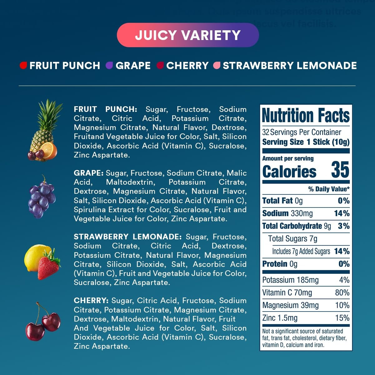 - CONVENIENT SINGLE-SERVE PACKETS: 32 portable packets perfect for on-the-go hydration. Ideal for travel, sports activities, and daily use. Mix 1 packet into 8 oz of water for effective hydration.