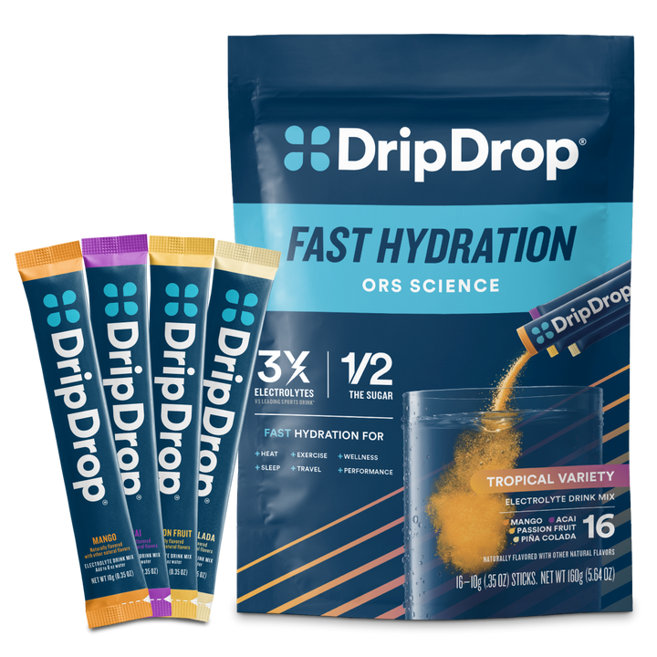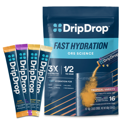 Doctor-developed DripDrop contains the sodium electrolyte levels and lower glucose content required to facilitate fast fluid absorption, AND it tastes great. Packed with essential electrolytes like sodium, potassium, and magnesium, plus zinc and vitamin C for immune support, it's an effective rehydration solution.