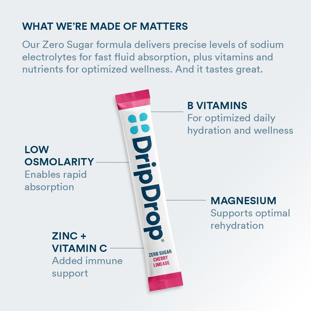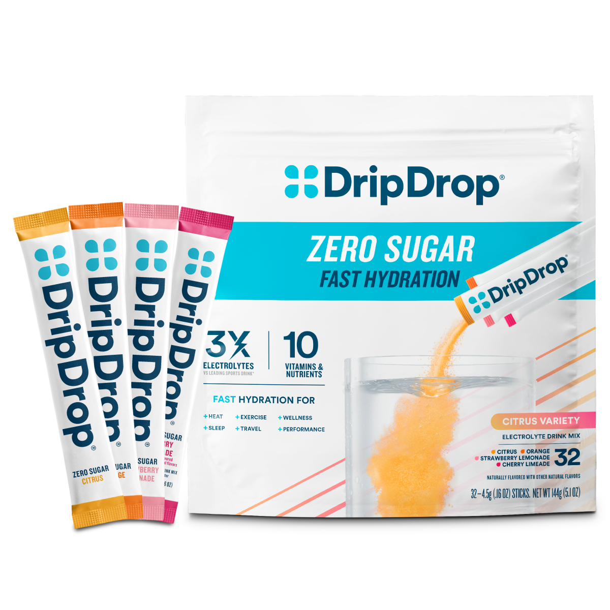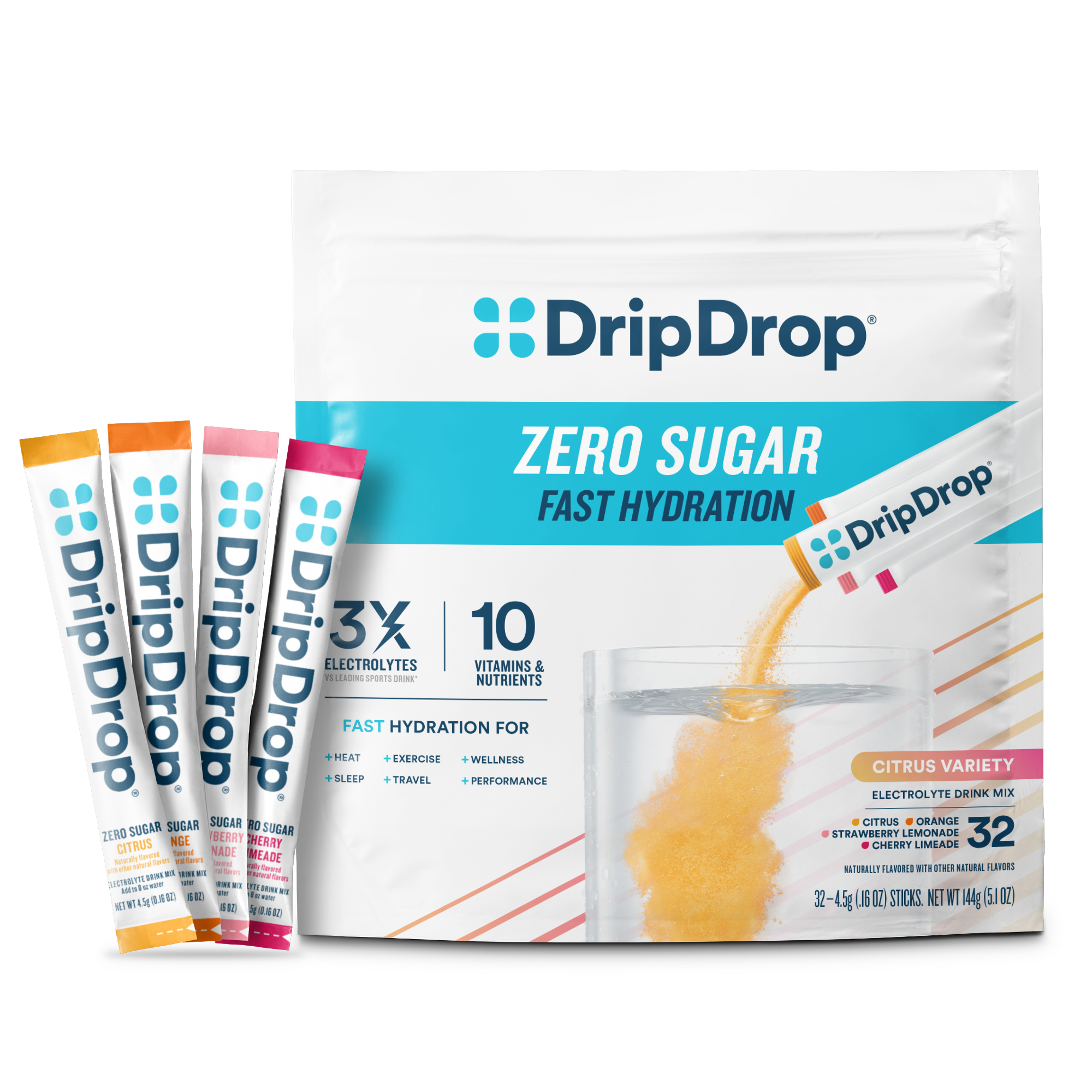Doctor-developed DripDrop contains the sodium electrolyte levels and lower glucose content required to facilitate fast fluid absorption, AND it tastes great. Packed with essential electrolytes like sodium, potassium, and magnesium, plus zinc and vitamin C for immune support, it's an effective rehydration solution.