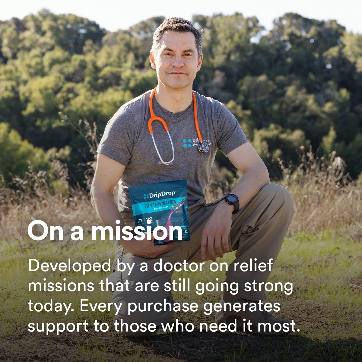 - TRUSTED BRAND WITH A MISSION: Developed by Dr. Eduardo Dolhun—an expert in oral rehydration therapy—during his humanitarian aid missions. DripDrop was created by him as a Public Benefit Corporation on a mission to defeat dehydration at home and abroad. Every DripDrop purchase generates donations to those who need it most. DripDrop is the fast-acting, delicious-tasting dehydration remedy trusted by doctors, firefighters, elite athletes and the U.S. Military.