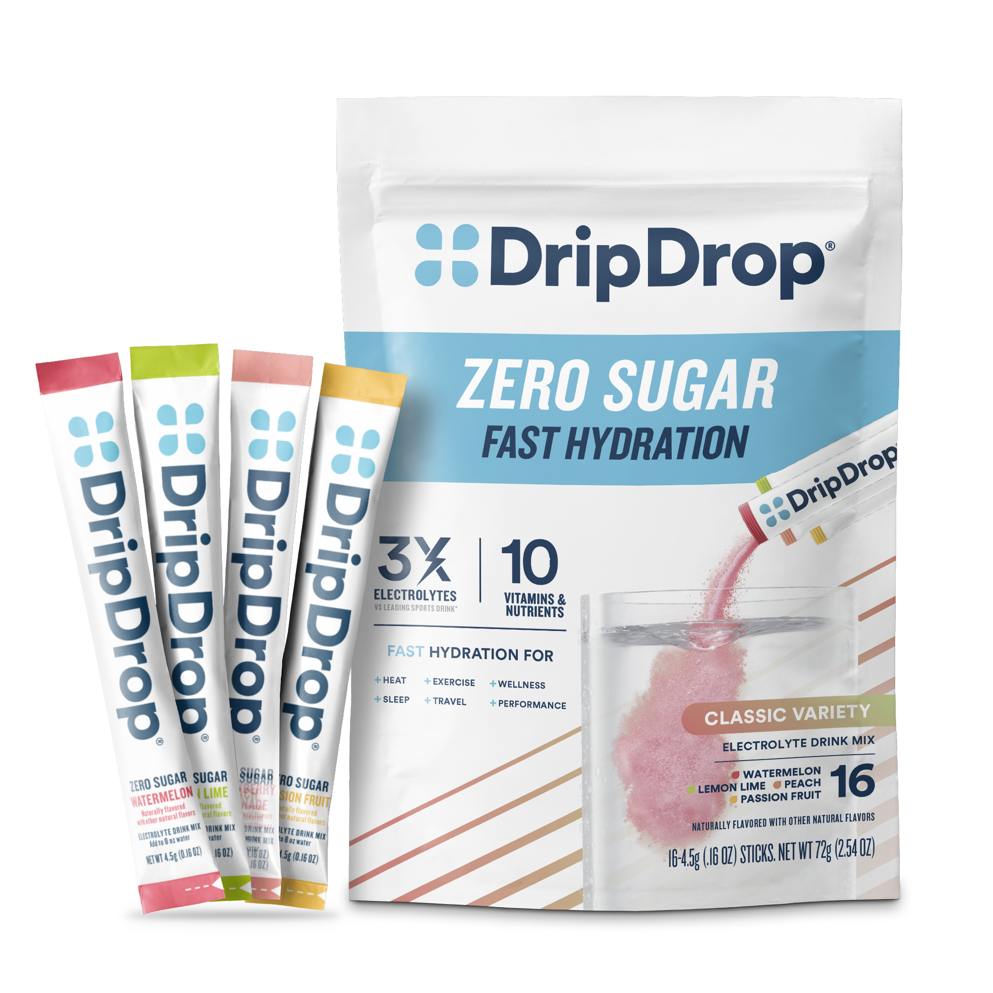 Doctor-developed DripDrop contains the sodium electrolyte levels and lower glucose content required to facilitate fast fluid absorption, AND it tastes great. Packed with essential electrolytes like sodium, potassium, and magnesium, plus zinc and vitamin C for immune support, it's an effective rehydration solution.