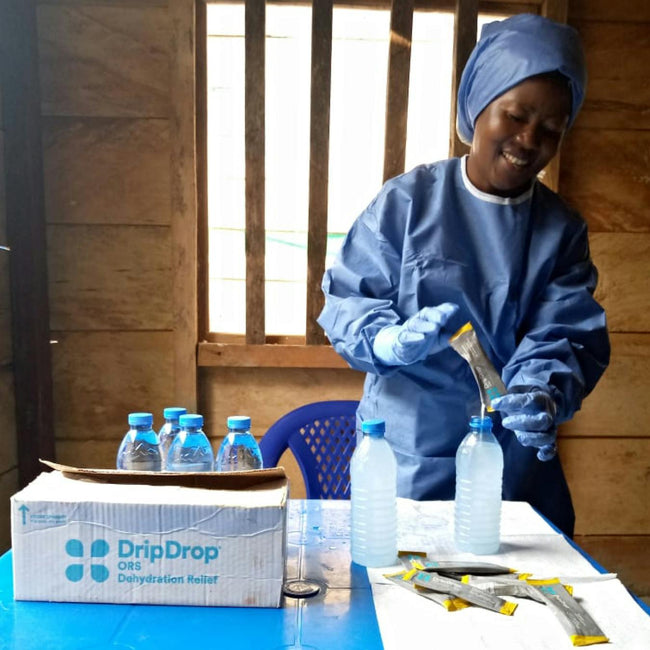 In 2019, DripDrop began a long-term partnership with International Medical Corps to respond to the Ebola crisis in Democratic Republic of the Congo. 55,000 sticks of DripDrop (and counting) have helped both patients and aid workers fight deadly dehydration here. These efforts have saved lives during the 2018-2020 North Kivu outbreak and the ongoing Équateur outbreak.